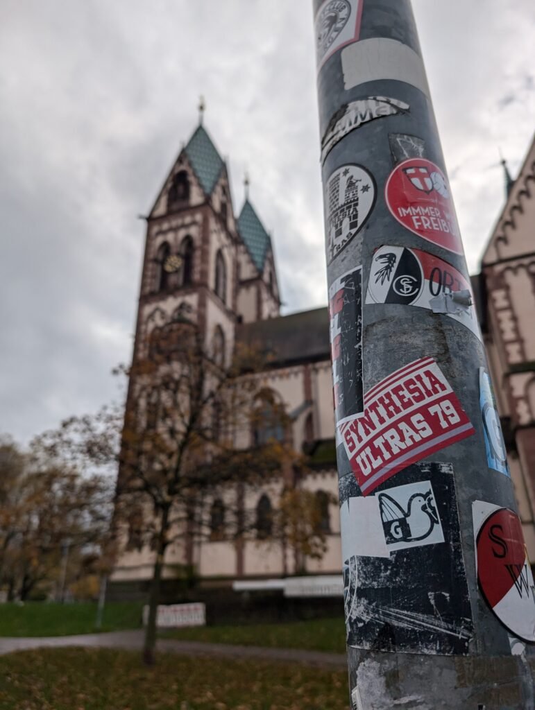 La ville frontalière, bombardée par trois fois entre 1914 et 1945 voit en son sein plusieurs styles architecturaux se compléter entre eux, au milieu d’édifices religieux impressionnants. La cathédrale de la ville est magnifique, Herz Jesu (Sacré-coeur) aussi, c’est d’ailleurs au pied de cette sensationnelle église gothique du 19ème siècle que les prémices du match se préparent, avec le passage d’un premier cortège d’ultras du SCF. Aucun poteau, aucun arrêt de tram ni aucune façade n’est vierge. Le SCF est partout, sticks, graffitis et écharpes, la cité aux quarante-deux quartiers vit au rythme du club au griffon, et ce depuis 1904, ou presque.