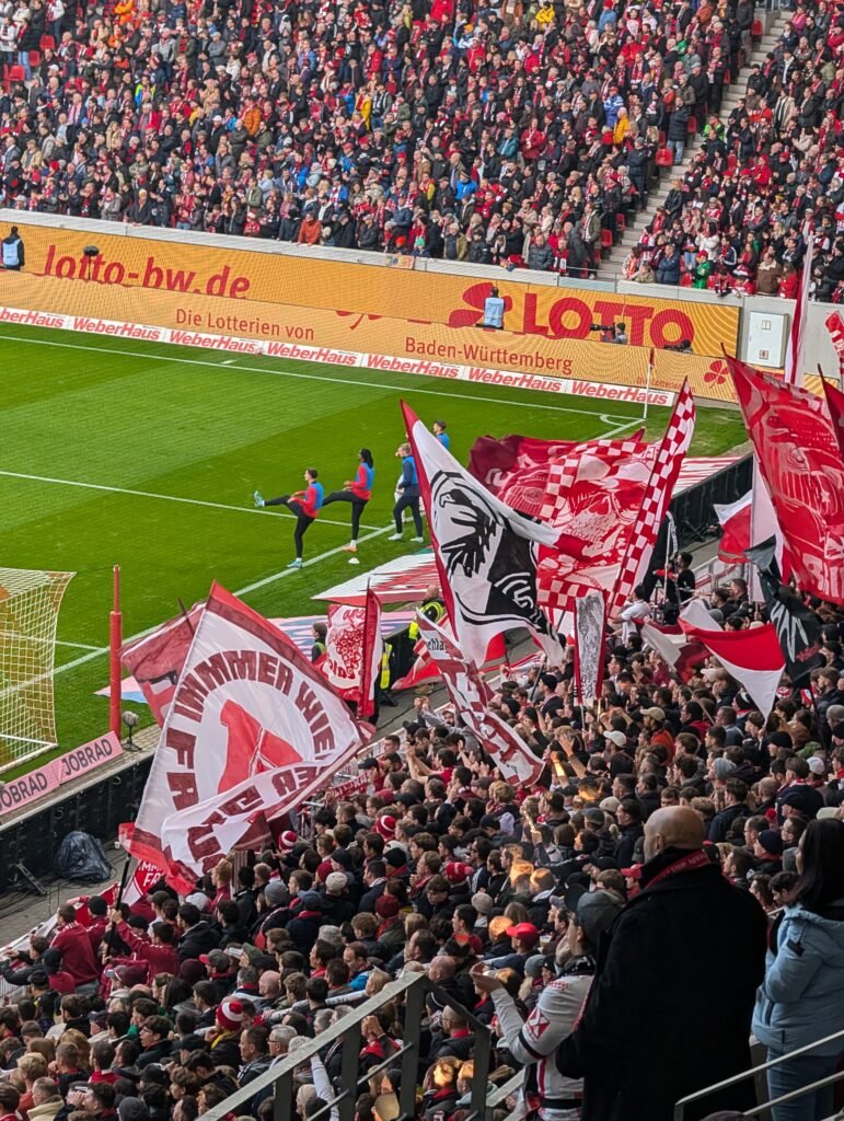 Rien n’y fait, les Nordistes restent barragistes après un temps additionnel interminable, qui se solde par la victoire en fanfare des habitants de Fribourg-en-Brisgau deux buts à un. Les Griffons déploient leurs ailes et prennent de la hauteur sur leurs adversaires du jour au classement, et la communion entre la Kurve Ultra de Freiburg et les joueurs ne tarde pas. Sourires jusqu’aux oreilles, ceux qui font de part et d’autre la grandeur de ce club, crampons aux pieds comme écharpe autour du coup se regardent droit dans mes yeux comme deux amoureux, et chantent à la gloire de leur bastion sacré.