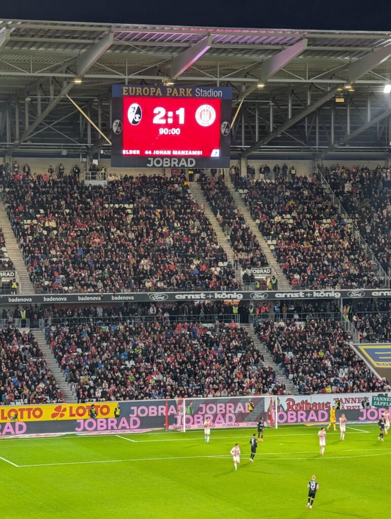 Les écharpes tournoient dans les airs, et la fête bat son plein dans les joyeuses travées de l’Europa Park Stadion. Le nom du japonais de 24 ans résonne dans toute la plaine, et les ultras du SCF explosent le compteur de décibels. L’entracte nous permet de nous hydrater à la bière locale (et ignoble), et nous voilà repartis. L’immondice consommée à la mi-temps me donne un mal de crâne conséquent, mais le but du break pour le SCF réveille tout le stade cinq petites minutes après la reprise, Freiburg 2, Sankt Pauli 0.