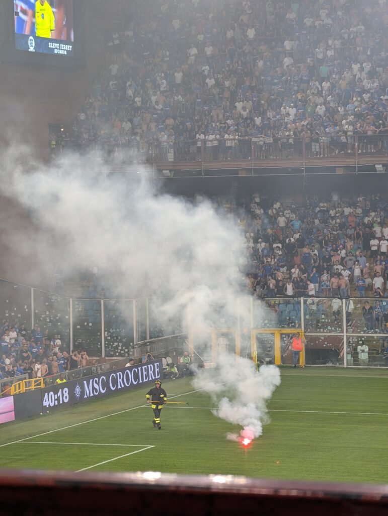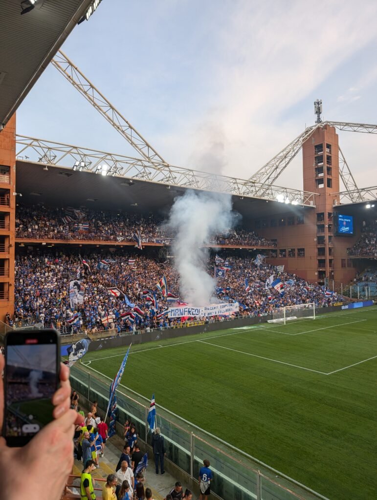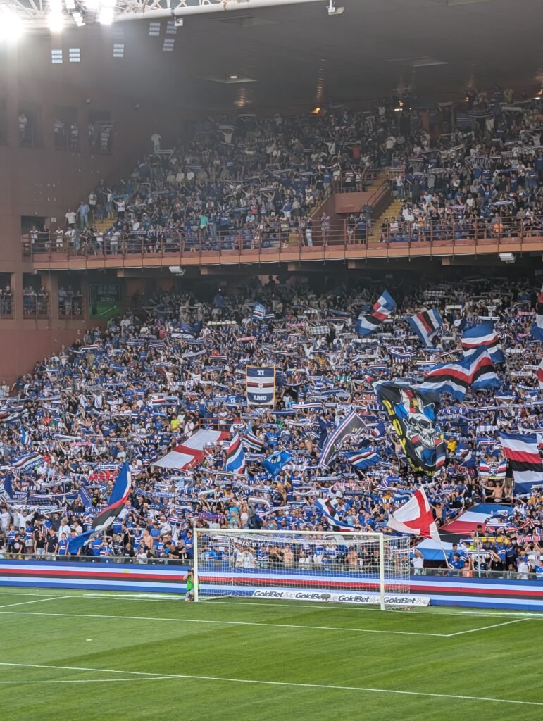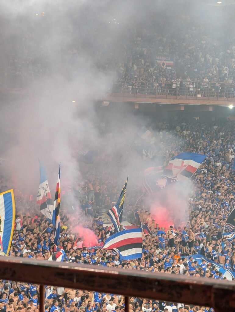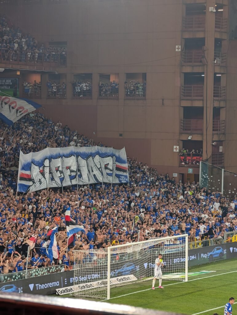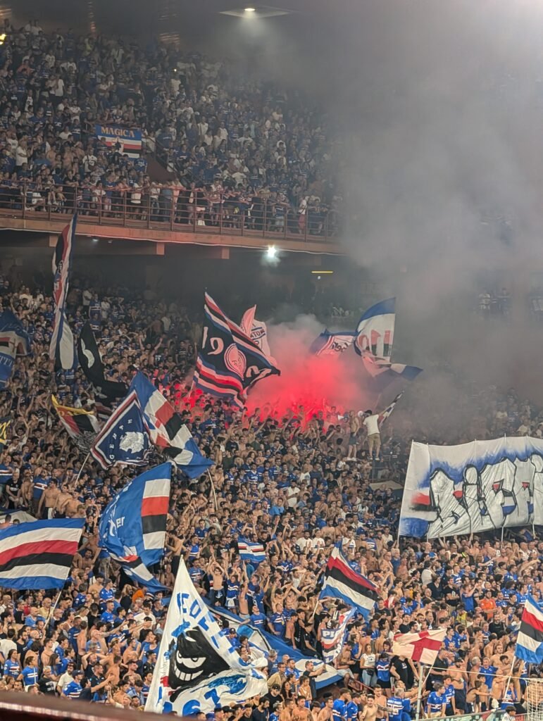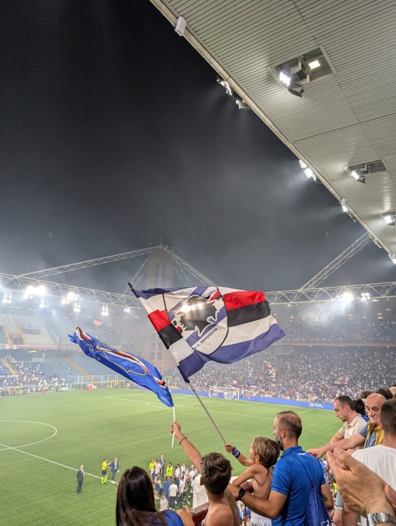 L’hymne de la Samp retentit, tous les drapeaux sont sortis, toutes les bannières brandies, les écharpes flottent et le spectacle coloré nous émeut quand les 30 000 supporters du soir s’égosillent pour faire vivre une tradition qui perdurera à jamais.