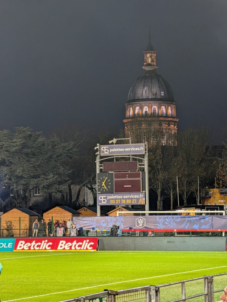 La nuit tombe, et le clocher de la cathédrale de Boulogne s’illumine, visible depuis le stade, ce joyau, symbole de la ville, semble être la bonne étoile de ses onze gladiateurs.
