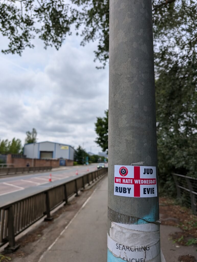 Et c’est d’ailleurs dans un fourré que j’ai eu l’immense bonheur d’apercevoir les premiers supporters de Sheffield United, trois Blades tout de blanc et de rouge vêtus (un des trois était en train de pisser dans un buisson, tradition locale sûrement).
