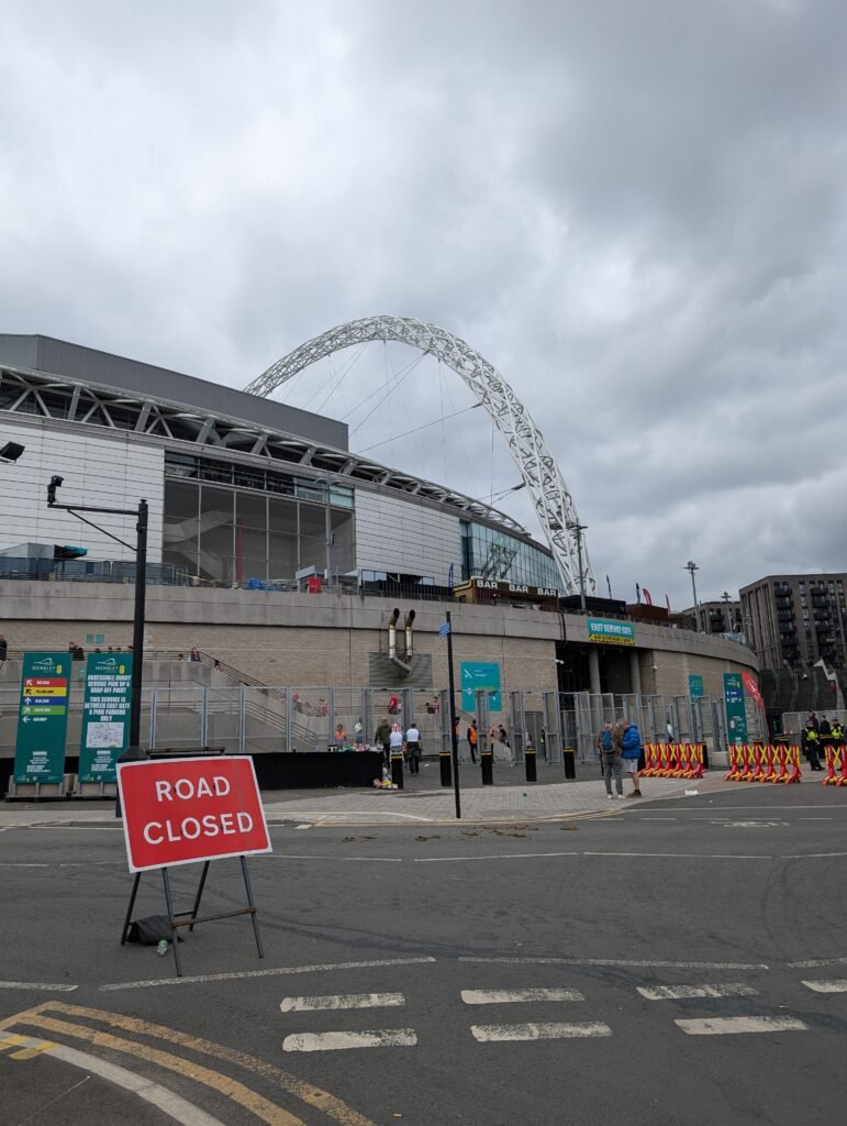Entre temps, un pigeon a cru bon de me souhaiter bonne chance en déferlant tout son stock de fiente sur mon bras gauche, de quoi me faire remarquer parmis la foule qui s’amasse sur le parvis de Wembley.