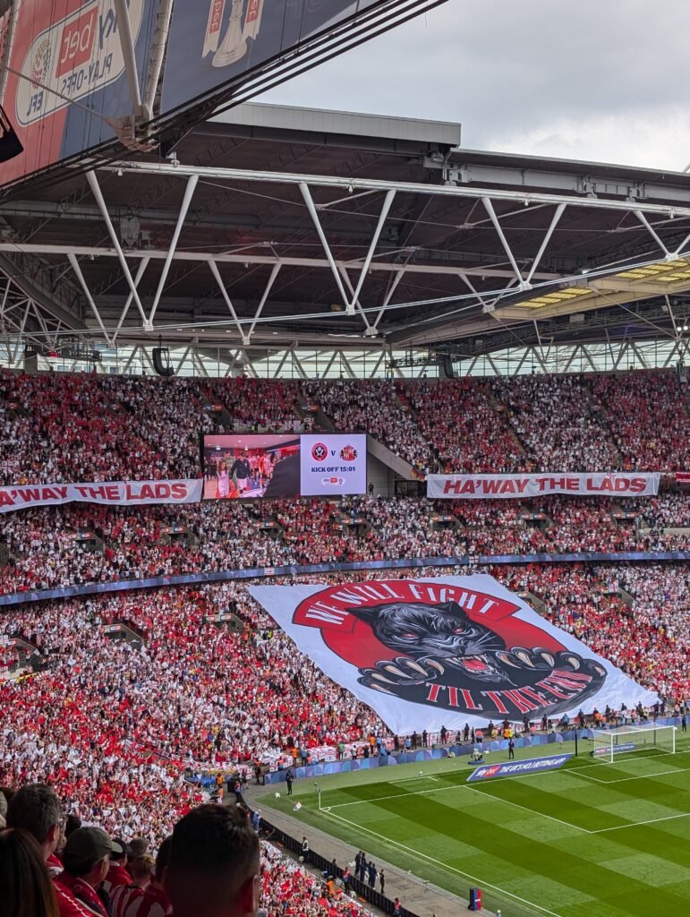 Un Tifo est déployé du côté de Sunderland, une panthère noire tout crocs sortis flanquée d’un « We will fight till the End » brille sous le Soleil de Londres.