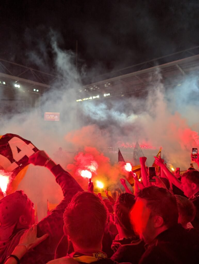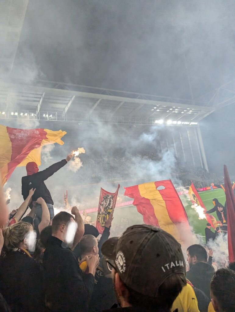 Les airs enragés repris par tous en coordination sont implacables, inarretables, instoppables. Bollaert est sur le toit du monde, et les onze gladiateurs ainsi que leurs remplaçants et tout le staff sont aclamés en héros dès que la partie prend fin. C’est irréel. On aurait presque du mal à y croire. La communion en devient ecclésiastique, toutes les bouches chantent en coeur, toutes les mains claquent en simultané. Le moment est émouvant, mais spontané. Les Tifos, la pyrotechnie et les rectangle vert étaient parfaits.